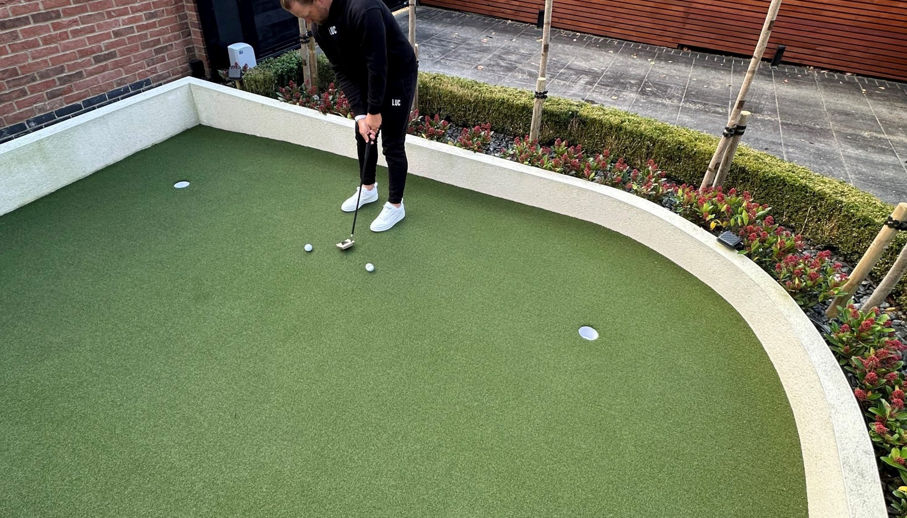 Measuring 11ft (3.5m) x 16ft (5m), Tom’s stylish, contemporary enclosed home golf green optimises his outdoor space. It incorporates three holes, meeting his specific requirements for a left to right putt up the left side and straight putt up the right hand side.