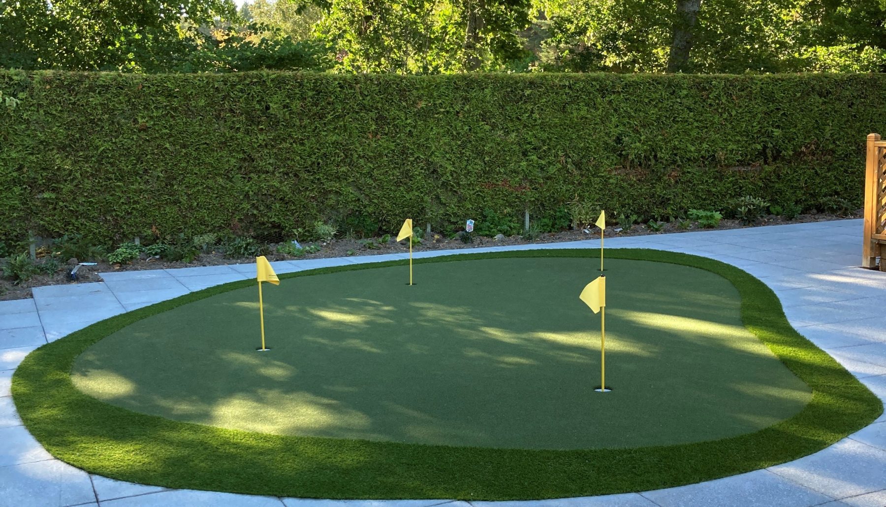 Huxley Golf designed and installed a Premier All-Weather Putting Green in a relaxing garden area. With a variety of interesting slopes and four holes, this green provides practice for borrowing and straight putts, all within a 20ft (6m) by 15ft (4.5m) space. It is finished with a smart and luxurious Premier Fringe 35 surround.